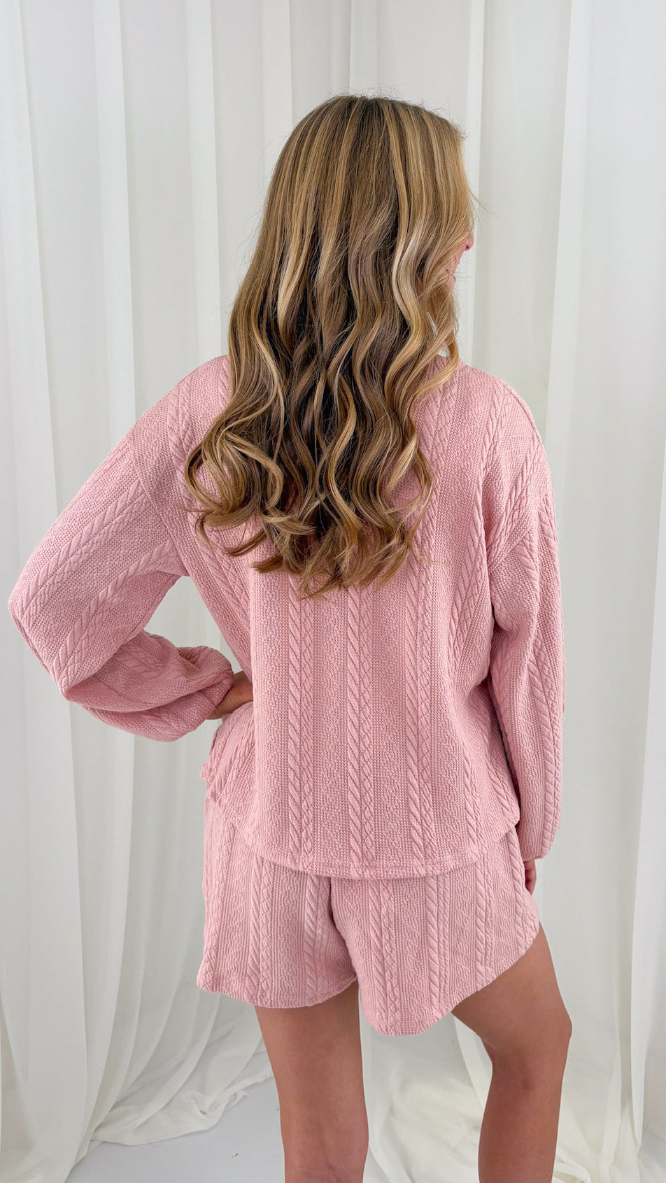 A pink cable knit set! Yes please! Comfy and effortlessly cute! Pair it with a white tank like we did or wear it buttoned up!